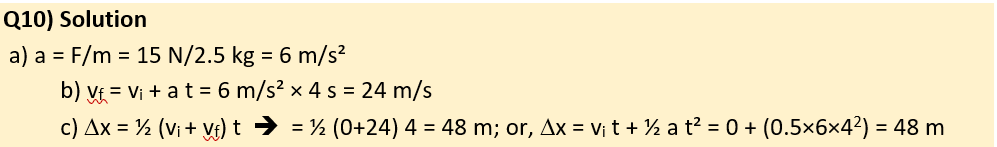 Q10) A 2.5 kg object initially at rest is subjected to a constant force of 15 N for 4 seconds.