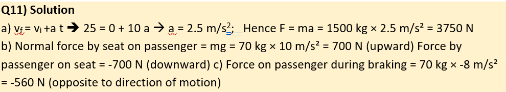 Q11) A 1500 kg car accelerates from rest to 25 m/s in 10 seconds on a horizontal road.
