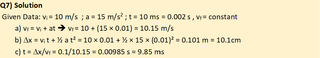 Q7) A neural impulse travels along an axon with an initial velocity of 10 m/s. As it passes through a myelinated region, it accelerates at a constant rate of 15 m/s² for 10 ms before reaching a constant velocity again.