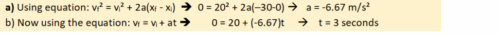 Q5) A car moving at 20 m/s is 30 meters away from a wall when the driver applies the brakes and manages to stop safely before reaching the wall.