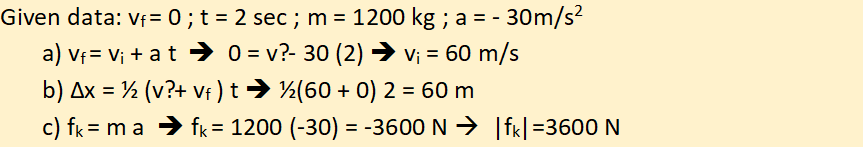 Q6) A moving race car has a mass of 1200 kg decelerate due to friction at 30 m/s² and it stopped completely after 2 s.