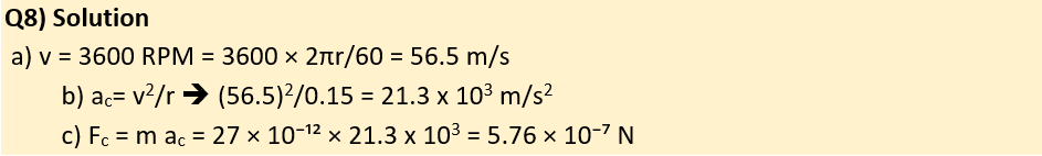 Q8) A medical centrifuge used to separate blood components rotates at 3600 RPM. The test tubes are placed in holders 15 cm from the axis of rotation.