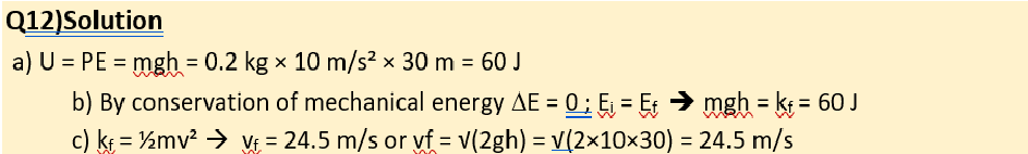 Q12) A 200 g ball is dropped from a height of 30 meters. Assuming no air resistance. Calculate: