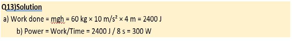 Q13) A student climbs a staircase that is 4 meters high in 8 seconds. If the student’s mass is 60 kg, calculate: